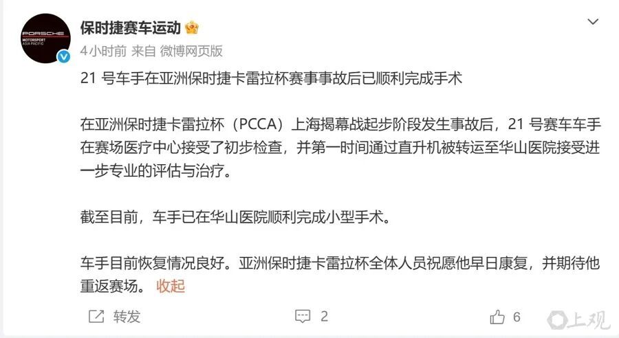 据中国首位F1赛季全勤报道者钱俊透露:3月15日,亚洲保时捷卡雷拉杯房车赛组委会发布通告,标题为 “最新消息:21号车车手手术成功”。通告表示,“在昨日上海揭幕战发车阶段发生事故后,保时捷卡雷拉杯亚洲组21号车车手已在华山医院成功接受小型手术。目前车手恢复情况良好,保时捷卡雷拉杯亚洲组全体人员祝愿他早日康复,期待他重返赛场。”